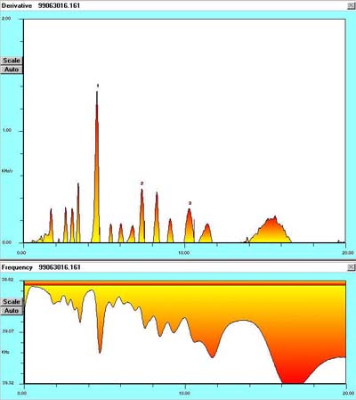 Plots of frequency vs. time (below) and derivatives of frequency vs. time (above) identify constituents of tomato sauce aroma analyzed by the zNose instrument. (Source: Electronic Sensor Technology)