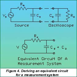 Consider the simplified measurement system model shown in Figure 4. The actual circuits of the oscilloscope and of the high impedance probe have been reduced to an equivalent parallel resistor-capacitor (RC) circuit. Similarly, as was done in a previous discussion, the circuit being measured has been simplified and reduced to its Thevenin equivalent form. If the circuit's source resistance, Rs, is approximately 50Ohms and the measurement is made using a conventional 10:1 high impedance probe, then it is reasonable to ignore the probe's 10 Mohm resistance, Ro. The equivalent circuit for the system now consists of a series resistance, Rs, and a shunt capacitance, with a value equal to the sum of the source, Cs, and the input capacitance of the probe/oscilloscope, Co.