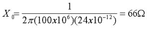 where the capacitive reactance, Xc, in Ohms, is an inverse function of frequency, f, in Hertz, and capacitance, C, in Farads. A simple calculation using the values from our previous example will show this increased loading. At a frequency of 100 MHz, the load impedance due to the total capacitance of 24 pF is: