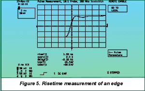 A pulse risetime measurement is made with an oscilloscope using a 10:1 probe which has a bandwidth at "the probe tip" of >250 MHz. The goal is to estimate the actual risetime of the signal. The oscilloscope's parameter readout provides the measured value, as shown in Figure 5. The oscilloscope manufacturer's specification provides a composite risetime for both the oscilloscope and the probe (assuming a 25 source impedance), combining both into a single value. The signal risetime can be estimated as follows: