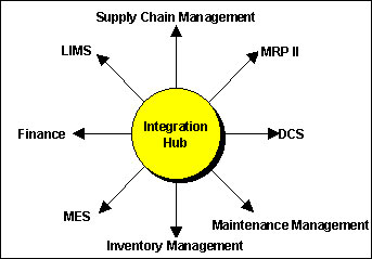 The hub itself behaves as a router between applications and establishes connectivity to the various applications through specific product adapters. The adapters can use one or many technologies with the same integrator, e.g. ODBC, COM, DCOM, Corba, XML, BizTalk. Using stored methods, it picks up the data from the initiating system, sends and maps this data to the target system. And it's not limited to raw data. It must also support the transmission of workflows, which consist of data and procedures packaged together and are hence knowledge based. An example of this is transmitting a complete certificate of analysis to the business system, including qc results, lot disposition, certificate format and lot genealogy.