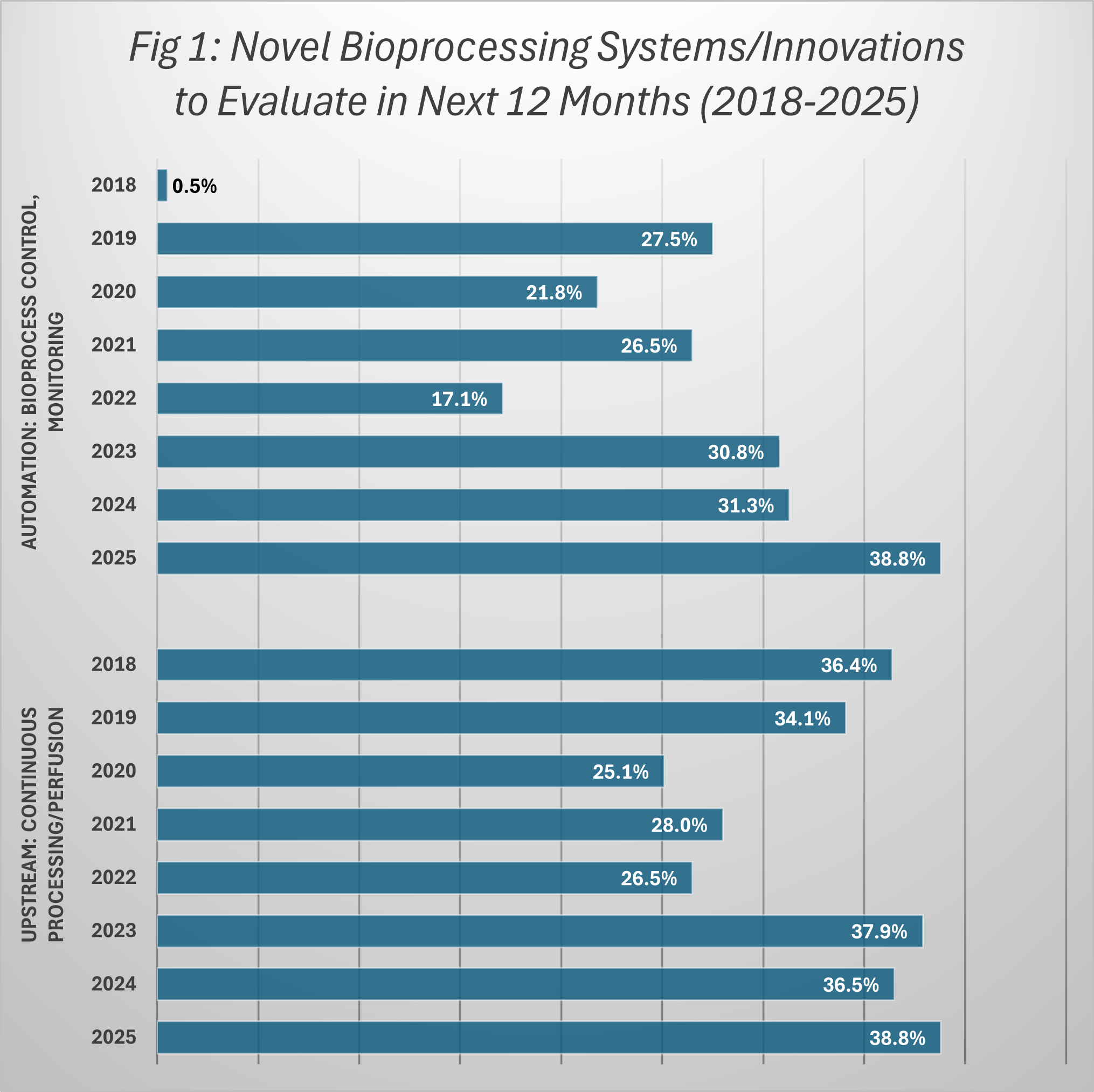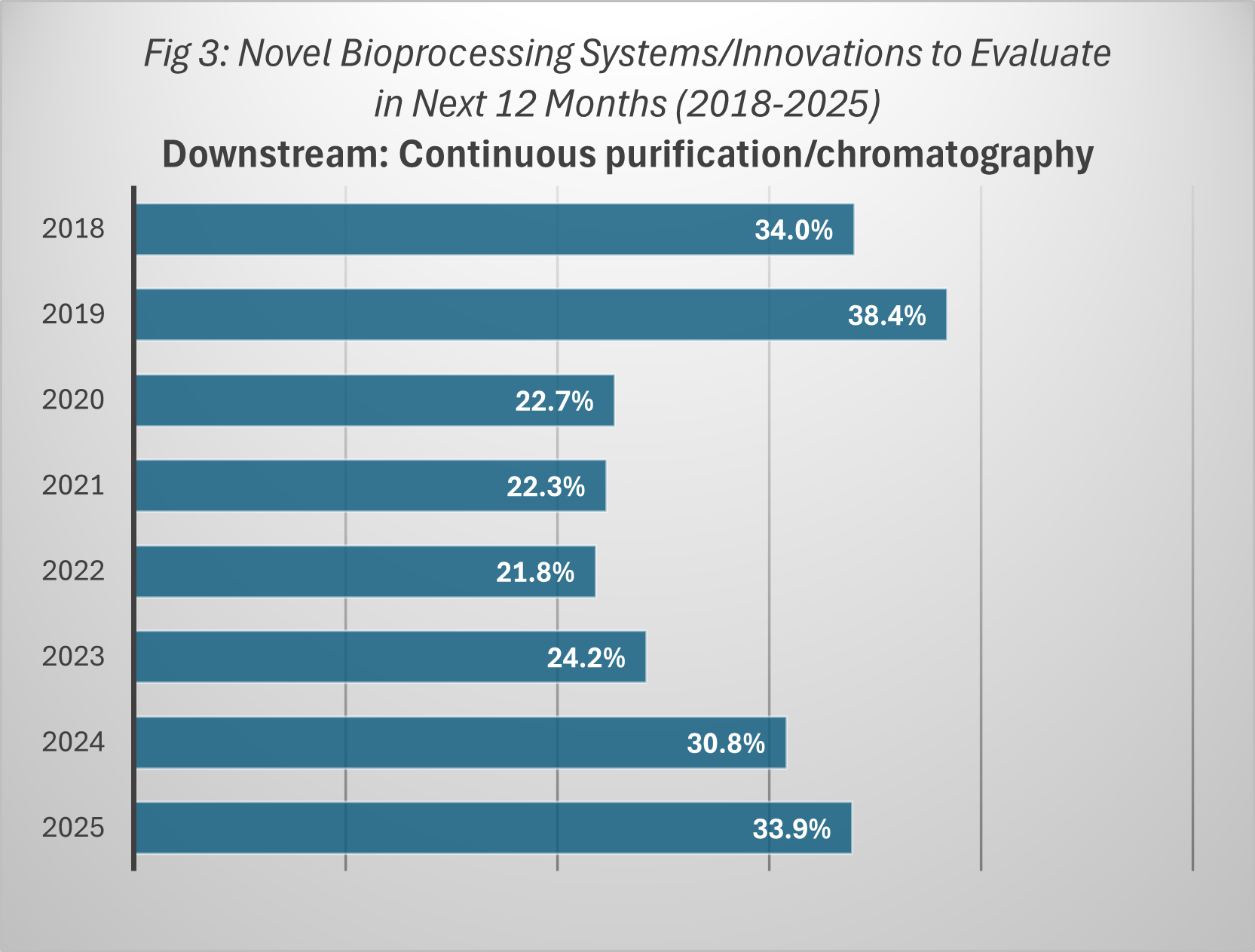 The growth in interest around continuous upstream processing is not a recent spike, but, instead, it’s part of a consistent long-term trend. Since 2018, more than one-third of facilities surveyed each year have indicated plans to test vendor innovations in this area. This willingness to evaluate dropped substantially during COVID but has returned to pre-COVID levels of interest in the past few years.