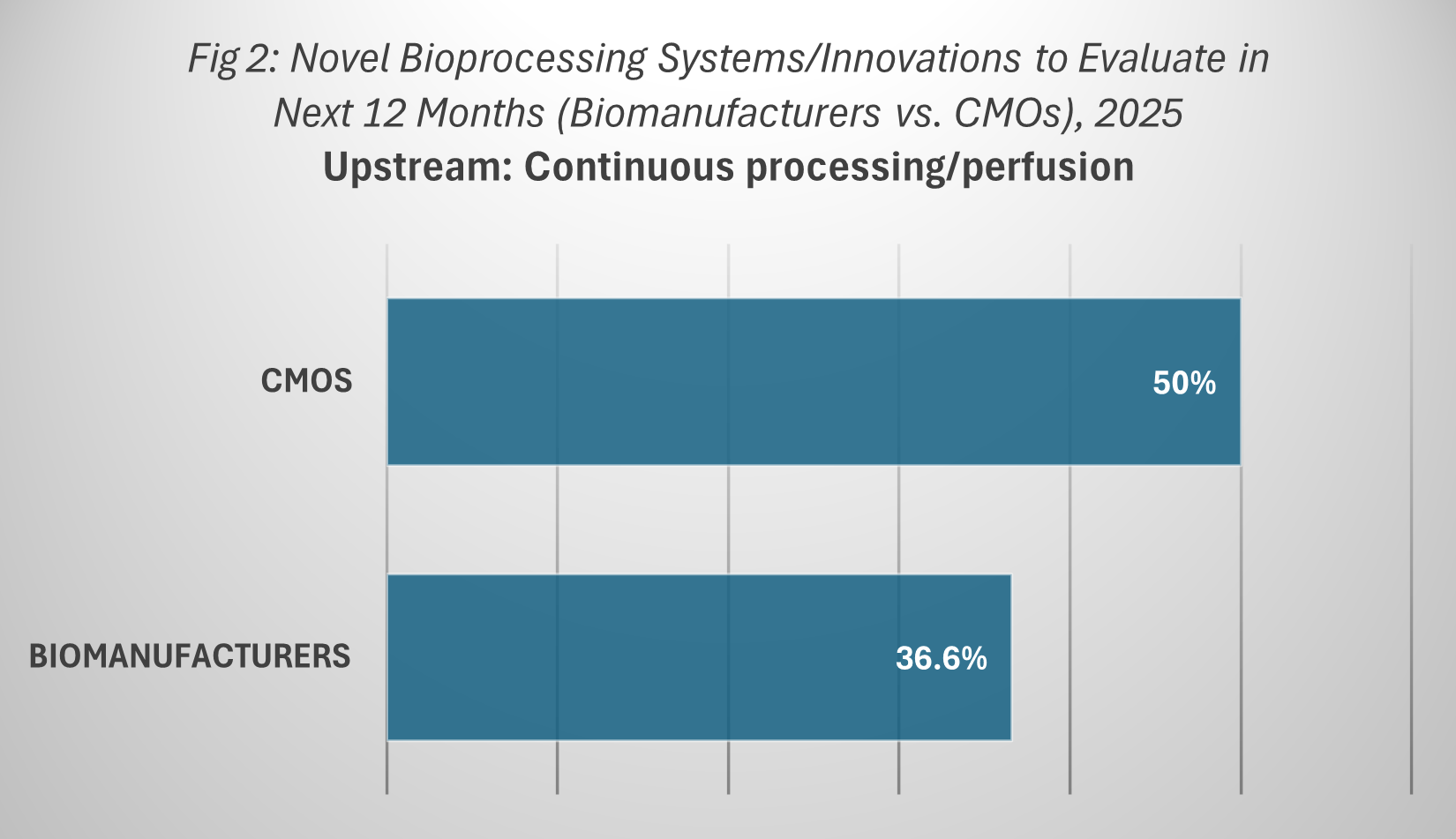 Contract manufacturing organizations (CMOs) are emerging as some of the most active participants in the evaluation and adoption of continuous upstream processing. According to BioPlan’s Annual Report, 50.0% of CMOs plan to evaluate continuous upstream processing or perfusion technologies in 2025. This compares to 36.6% of in-house biomanufacturers, underscoring a notable gap in adoption intent between service providers and product originators.