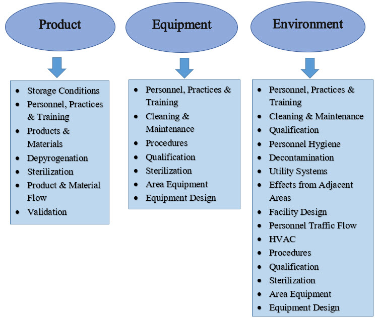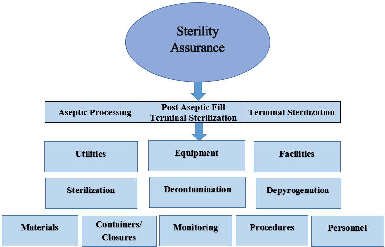 The design for sterile processing should be driven toward a singular goal of optimizing contamination control with a particular focus on the microbial risk impact of personnel. The specific means vary but should be of prime consideration in process design. The figure below outlines the elements that contribute to sterility assurance.